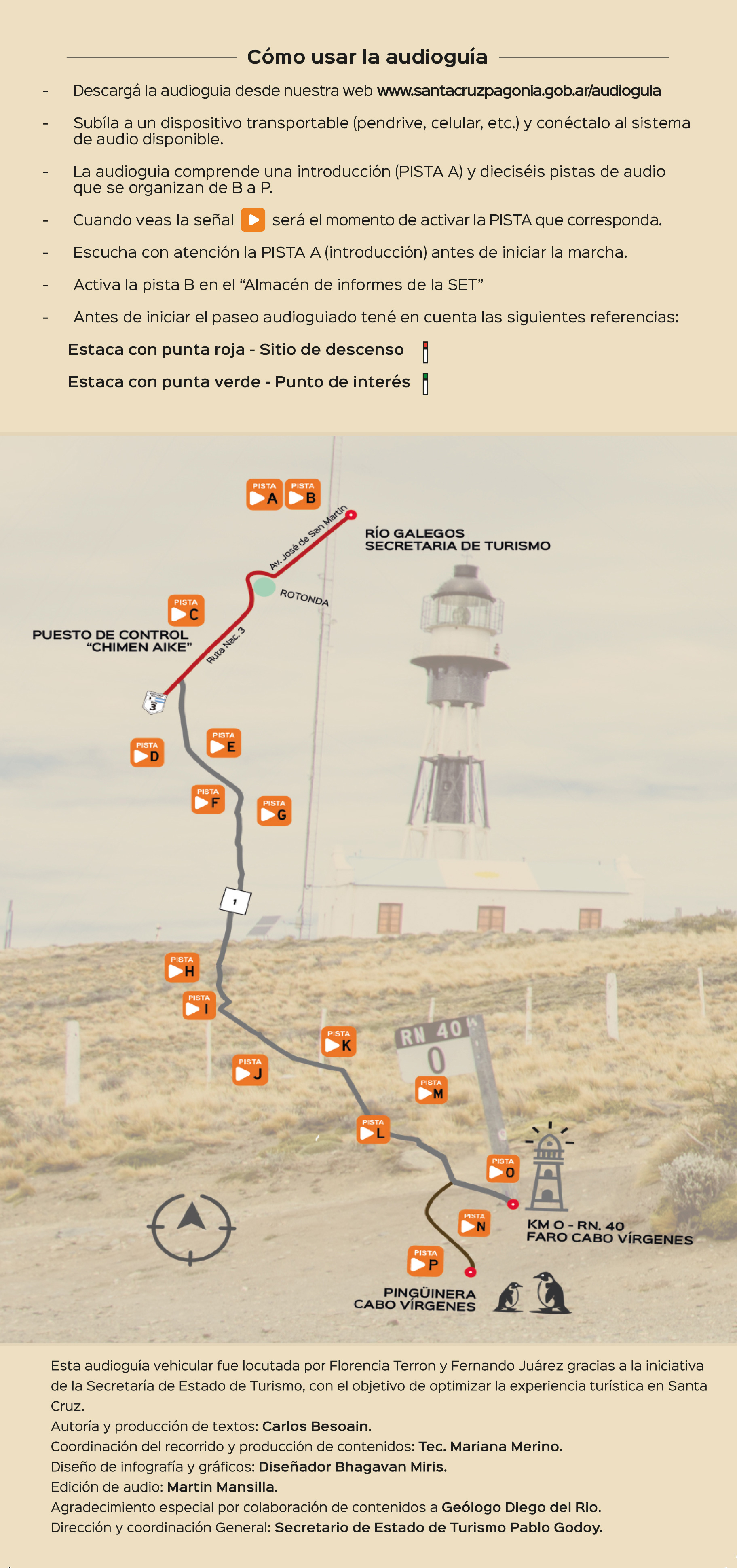 Te invitamos a utilizar la audioguía "Reserva Provincial Cabo Vírgenes" durante tu viaje. Descubrirás historias de antiguas expediciones, de los primeros intentos de fundación de la capital provincial, del faro y una interesante descripción de la pingüinera del kilómetro cero de la Ruta Nacional 40.